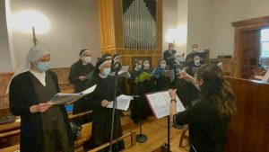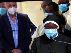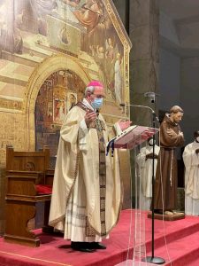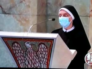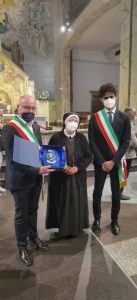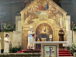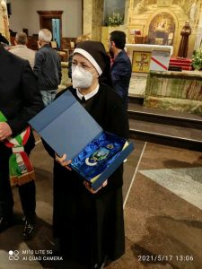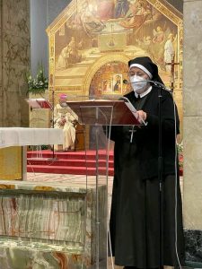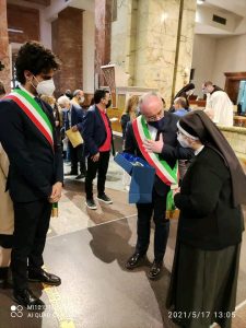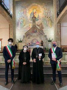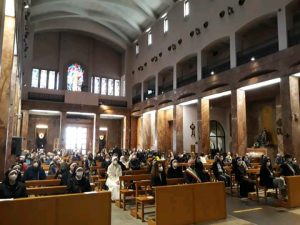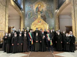 Il legame spirituale con Padre Pio si è così saldato che ha preso corpo in due istituzioni: le Apostole e gli Apostoli di Gesù Crocifisso. Il nostro essere qui, oggi, è per cantare al Signore la nostra gioia e gratitudine sebbene questo tempo di pandemia ci costringa a rinunciare a festeggiare come avremmo desiderato tutti, standogli intorno con la presenza fisica. All’intercessione della Madonna delle Grazie e di San Pio desideriamo affidare la nostra missione, affinché, fedeli al nostro carisma, teniamo alta la Parola di Vita e rendiamo visibile la Misericordia di Dio, nelle scelte e nelle attività finalizzate particolarmente a quelle delle “periferie esistenziali”, là dove la canna incrinata soffre minaccia di essere spezzata, là dove il lucignolo fumigante rischia di essere spento (Cf Is 42,3). È uno dei passi che il Padre aveva tanto a cuore, quello di Isaia 42. All’unico Signore, Trinità Santa, il sommo onore e la gloria. Amen!